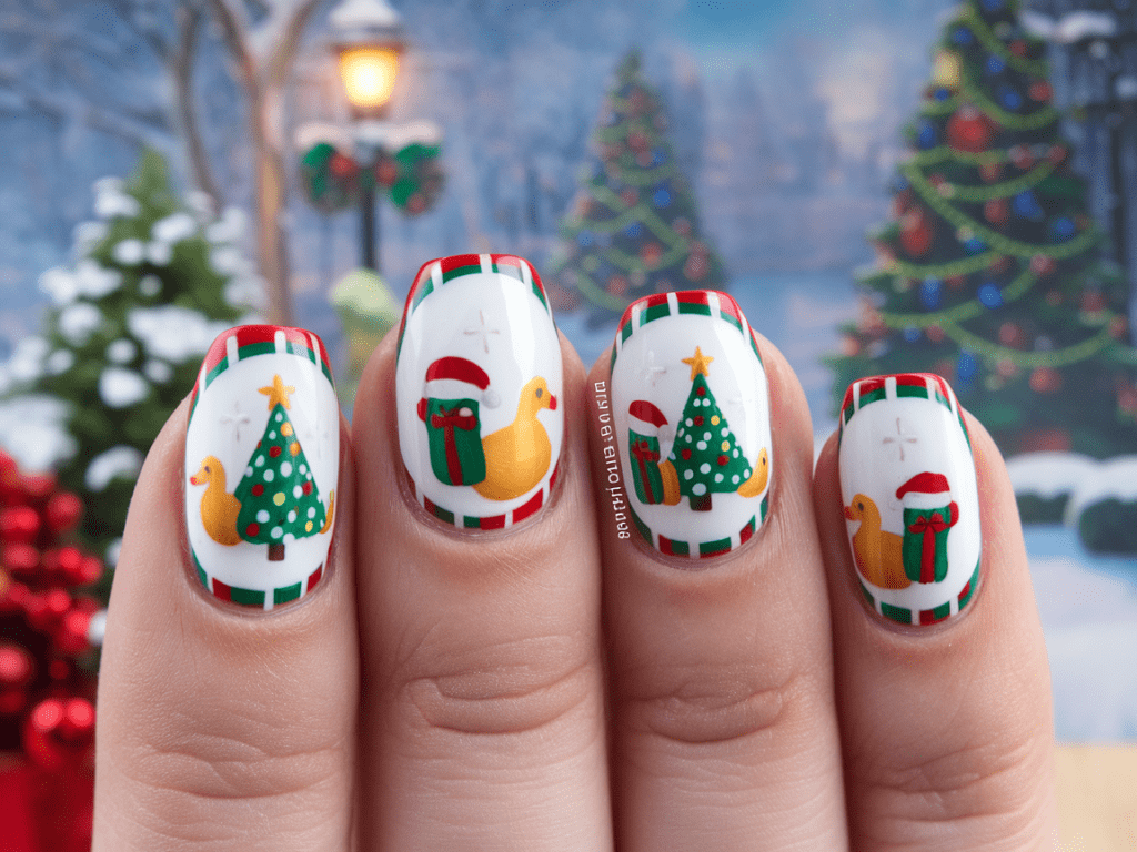 - Red and green scream “Christmas,” but duck nails take them to the next level.
