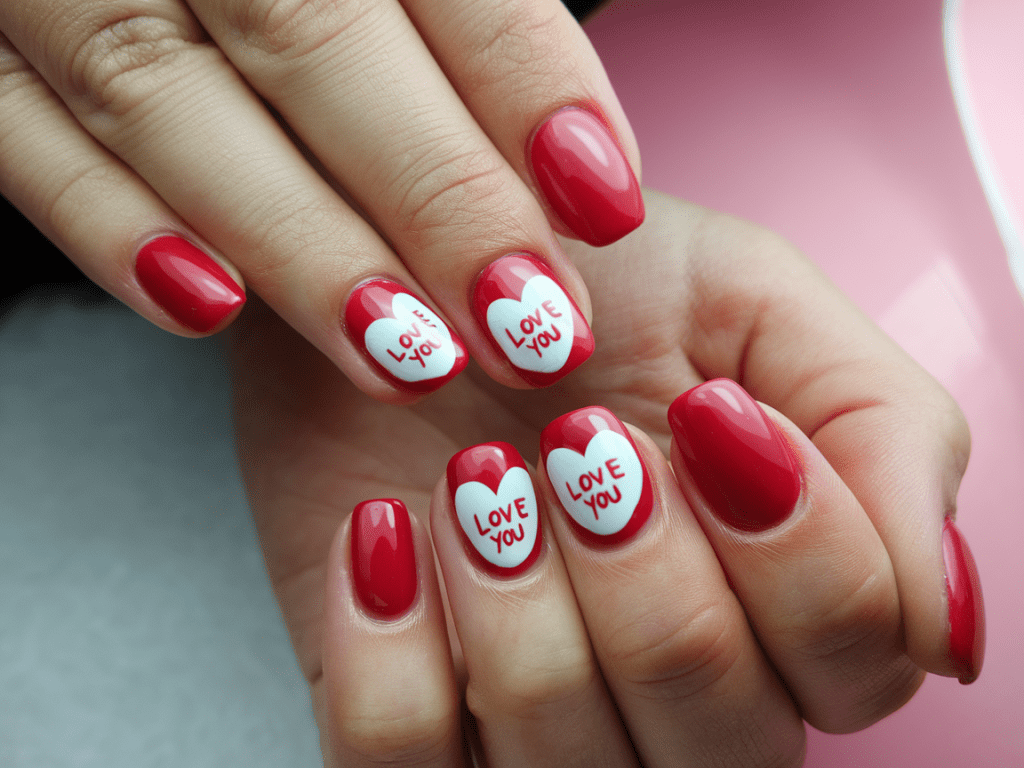 White nails with red hearts look like they came straight out of a rom-com. It’s playful, clean, and oh-so-festive.