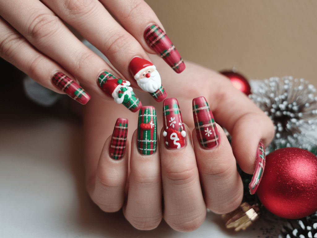 Plaid nails? Total holiday classic. They’re cozy, cute, and give serious “wrapped in a blanket by the fire” energy.