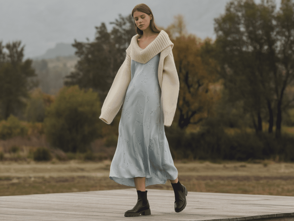 👗 18. Slip Dress + Oversized Sweater + Booties