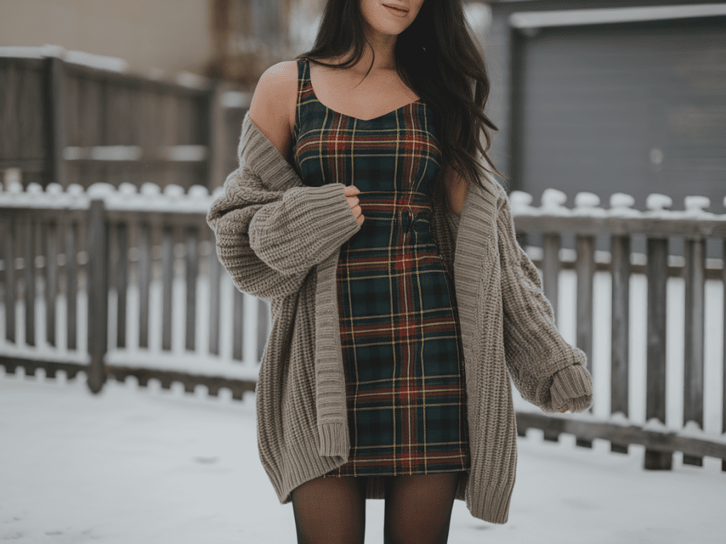 ❄️ 13. Tartan Mini Dress + Oversized Cardigan