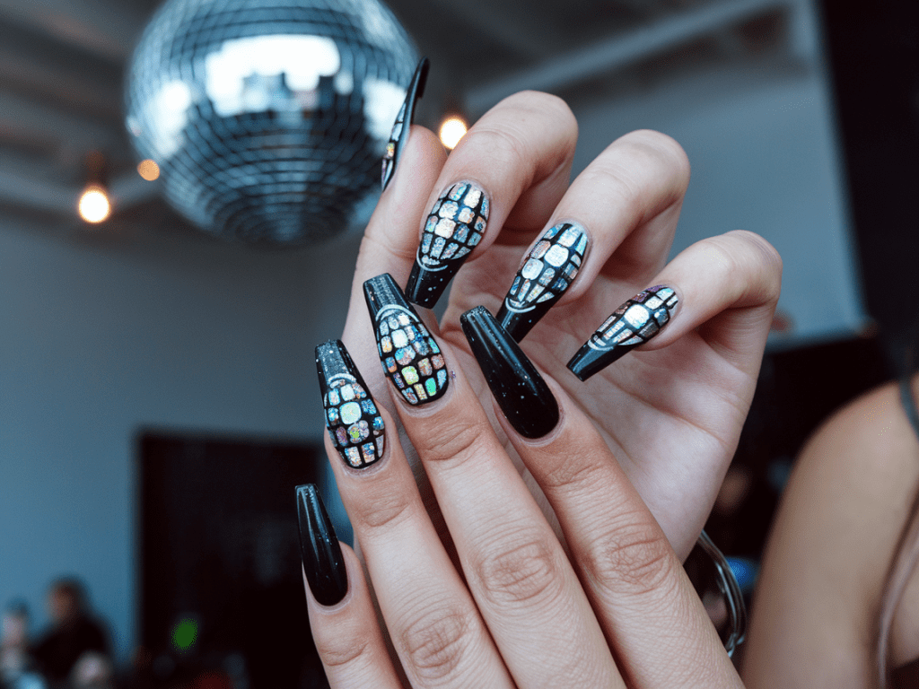 - Accent: Apply silver or holographic glitter with a chunky texture to create that disco ball effect.